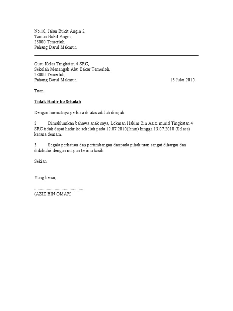 Contoh Surat Tidak Hadir Ke Sekolah Atau Asrama Pdf